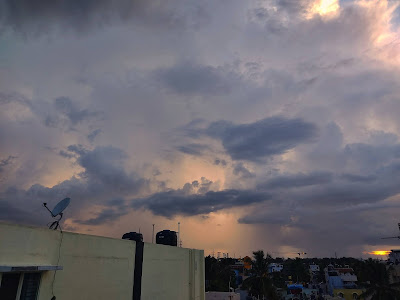 As usual, we went for our daily terrace visit at 5:30PM and undoubtedly the sky was action packed. The troposphere was covered with thick nimbus clouds. The sky was turned into battlefield for thick clouds which resulted in thunder and lightning at distant horizon. Perhaps, few areas of city would have been blessed with bountiful rains. Few cloud moved due west resulting in rain shaft. It was amazing to watch the phenomenon. My mobile camera captured timelapse of entire event with few pictures of rain-shaft to conclude. The Arcs of lightning too were alluring but one of my son injured his leg which prompted us to return back home. Here are the pictures for you!
